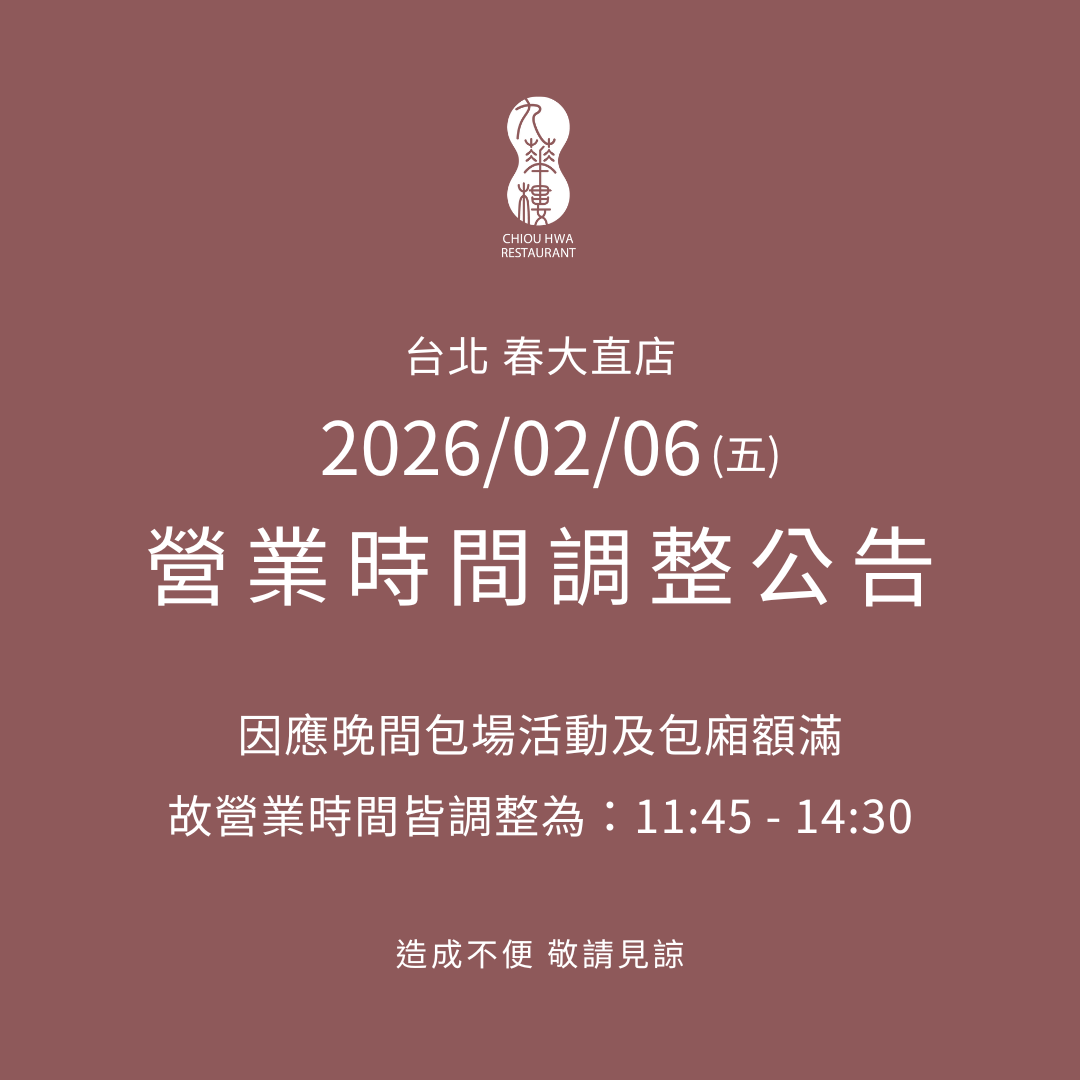 台北春大直店2026/02/06(五)晚間因舉辦包場活動且包廂已預約額滿,所以當晚不對外開放。